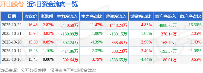 证券之星消息,截至2025年10月22日收盘,开山股份(300257)报收于16.43元,上涨2.82%,换手率1.91%,成交量18.22万手,成交额3.0亿元。