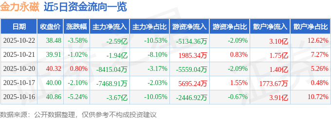 证券之星消息,截至2025年10月22日收盘,金力永磁(300748)报收于38.48元,下跌3.58%,换手率5.65%,成交量63.9万手,成交额24.59亿元。