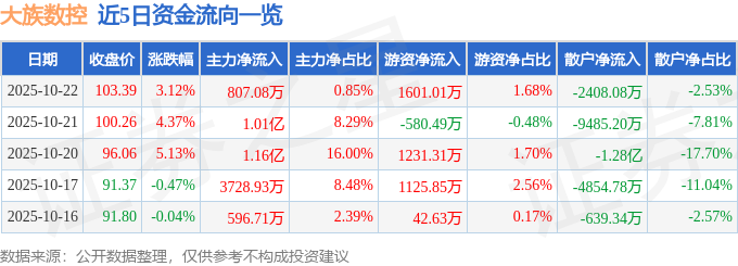10月22日的资金流向数据方面,主力资金净流入807.08万元,占总成交额0.85%,游资资金净流入1601.01万元,占总成交额1.68%,散户资金净流出2408.08万元,占总成交额2.53%。