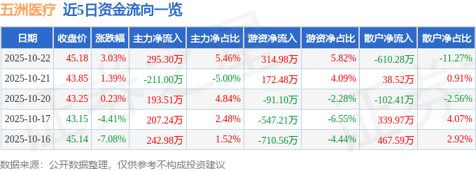证券之星消息,截至2025年10月22日收盘,五洲医疗(301234)报收于45.18元,上涨3.03%,换手率1.79%,成交量1.22万手,成交额5413.03万元。