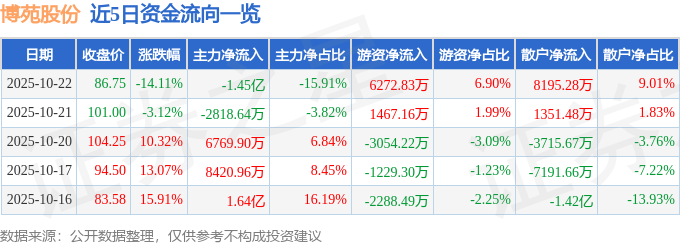 证券之星消息,截至2025年10月22日收盘,博苑股份(301617)报收于86.75元,下跌14.11%,换手率29.32%,成交量9.8万手,成交额9.1亿元。