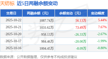 证券之星消息,10月22日,天纺标(920753)融资买入140.94万元,融资偿还84.81万元,融资净买入56.13万元,融资余额1087.74万元。