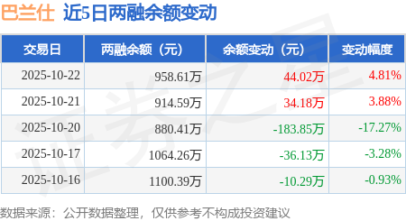 证券之星消息,10月22日,巴兰仕(920112)融资买入79.65万元,融资偿还35.63万元,融资净买入44.02万元,融资余额958.61万元。
