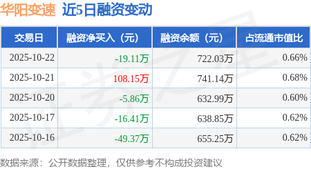 证券之星消息,10月22日,华阳变速(920146)融资买入57.56万元,融资偿还76.67万元,融资净卖出19.11万元,融资余额722.03万元。