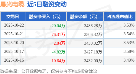证券之星消息,10月22日,晨光电缆(920639)融资买入49.24万元,融资偿还69.28万元,融资净卖出20.04万元,融资余额3486.28万元。