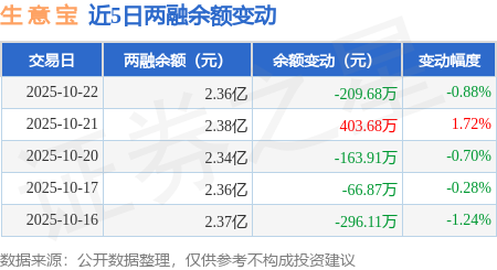证券之星消息,10月22日,生 意 宝(002095)融资买入614.54万元,融资偿还824.22万元,融资净卖出209.68万元,融资余额2.36亿元。