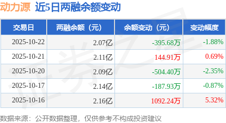 证券之星消息,10月22日,动力源(600405)融资买入558.94万元,融资偿还954.62万元,融资净卖出395.68万元,融资余额2.07亿元。