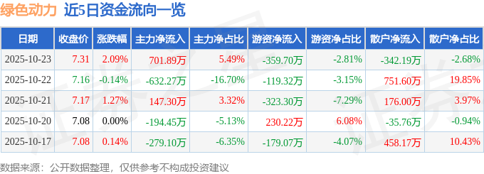 证券之星消息,截至2025年10月23日收盘,绿色动力(601330)报收于7.31元,上涨2.09%,换手率1.77%,成交量17.53万手,成交额1.28亿元。