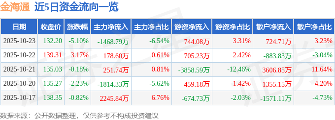 证券之星消息,截至2025年10月23日收盘,金海通(603061)报收于132.2元,下跌5.1%,换手率4.02%,成交量1.68万手,成交额2.25亿元。