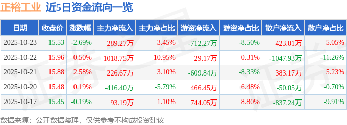 证券之星消息,截至2025年10月23日收盘,正裕工业(603089)报收于15.53元,下跌2.69%,换手率2.25%,成交量5.4万手,成交额8376.17万元。