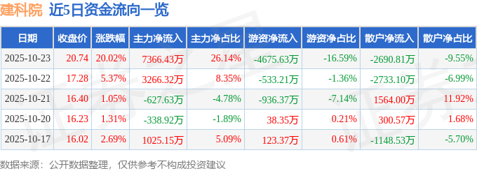 证券之星消息,截至2025年10月23日收盘,建科院(300675)报收于20.74元,上涨20.02%,涨停,换手率9.26%,成交量13.59万手,成交额2.82亿元。