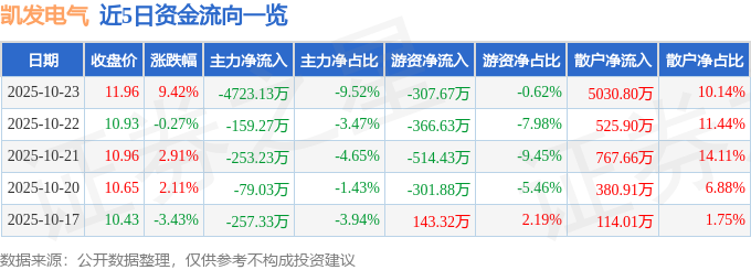 证券之星消息,截至2025年10月23日收盘,凯发电气(300407)报收于11.96元,上涨9.42%,换手率16.69%,成交量40.39万手,成交额4.96亿元。