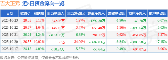 证券之星消息,截至2025年10月23日收盘,吉大正元(003029)报收于28.05元,上涨5.17%,换手率14.1%,成交量24.42万手,成交额6.8亿元。
