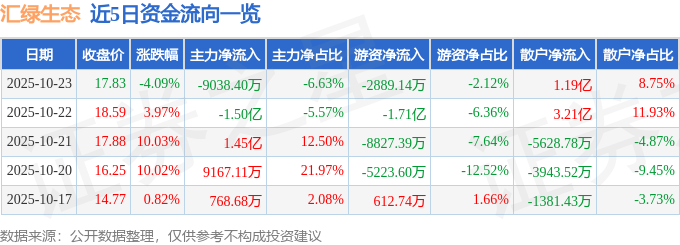 证券之星消息,截至2025年10月23日收盘,汇绿生态(001267)报收于17.83元,下跌4.09%,换手率12.81%,成交量77.65万手,成交额13.64亿元。