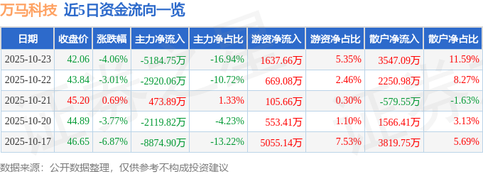 证券之星消息,截至2025年10月23日收盘,万马科技(300698)报收于42.06元,下跌4.06%,换手率6.13%,成交量7.27万手,成交额3.06亿元。