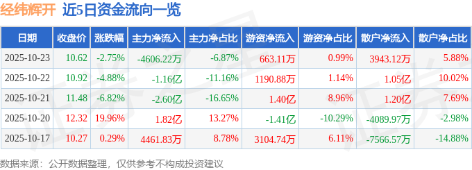 证券之星消息,截至2025年10月23日收盘,经纬辉开(300120)报收于10.62元,下跌2.75%,换手率12.01%,成交量63.35万手,成交额6.7亿元。