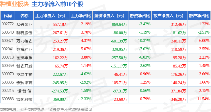 从资金流向上来看,当日种植业板块主力资金净流出8614.93万元,游资资金净流出4913.76万元,散户资金净流入1.35亿元。种植业板块个股资金流向见下表: