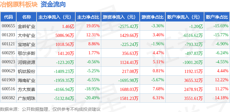 从资金流向上来看,当日冶钢原料板块主力资金净流入8064.13万元,游资资金净流入1900.39万元,散户资金净流出9964.52万元。冶钢原料板块个股资金流向见下表: