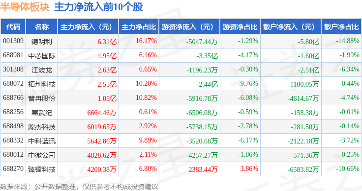 从资金流向上来看,当日半导体板块主力资金净流出29.71亿元,游资资金净流入3.74亿元,散户资金净流入25.97亿元。半导体板块个股资金流向见下表: