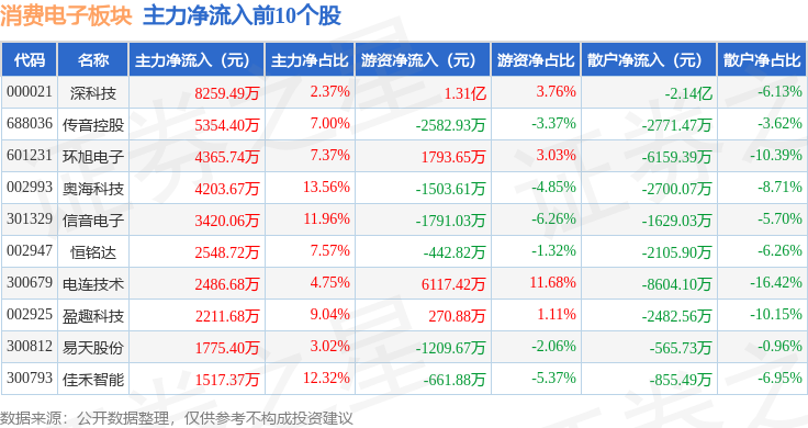 从资金流向上来看,当日消费电子板块主力资金净流出18.74亿元,游资资金净流入2.16亿元,散户资金净流入16.58亿元。消费电子板块个股资金流向见下表:
