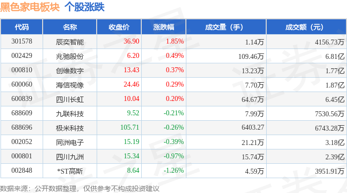 证券之星消息,10月23日黑色家电板块较上一交易日上涨0.09%,辰奕智能领涨。当日上证指数报收于3922.41,上涨0.22%。深证成指报收于13025.45,上涨0.22%。黑色家电板块个股涨跌见下表: