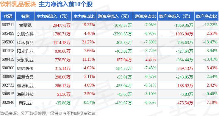从资金流向上来看,当日饮料乳品板块主力资金净流出1.3亿元,游资资金净流出7487.42万元,散户资金净流入2.05亿元。饮料乳品板块个股资金流向见下表: