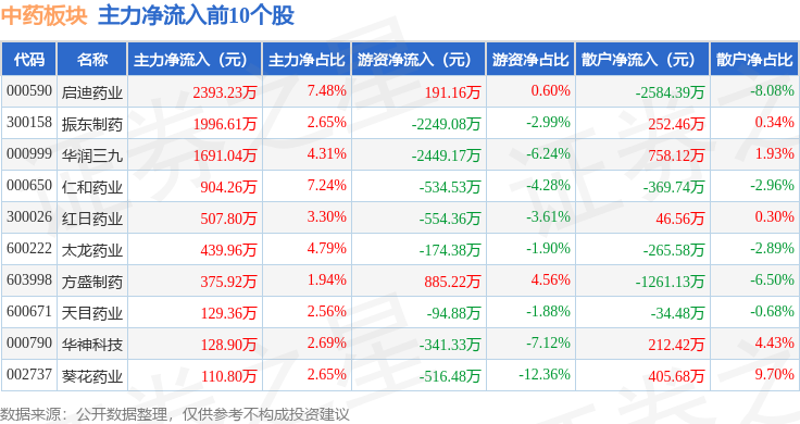 从资金流向上来看,当日中药板块主力资金净流出8.97亿元,游资资金净流出9257.48万元,散户资金净流入9.89亿元。中药板块个股资金流向见下表: