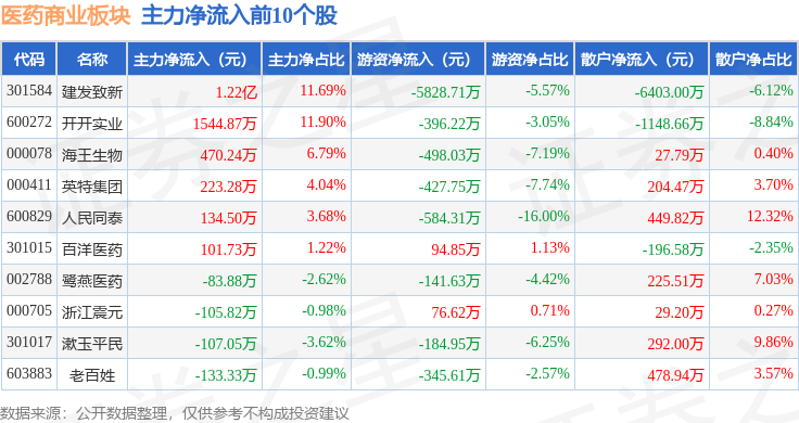 从资金流向上来看,当日医药商业板块主力资金净流出9704.83万元,游资资金净流出1.17亿元,散户资金净流入2.14亿元。医药商业板块个股资金流向见下表: