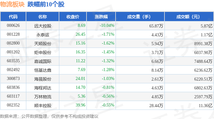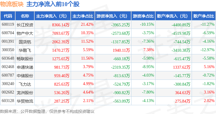 从资金流向上来看,当日物流板块主力资金净流出2051.06万元,游资资金净流出9590.69万元,散户资金净流入1.16亿元。物流板块个股资金流向见下表: