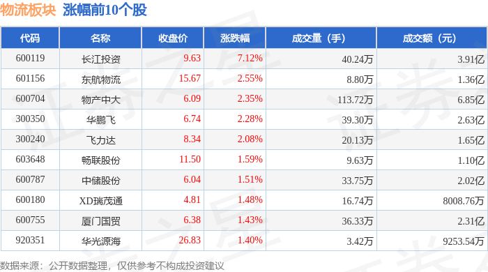 证券之星消息,10月23日物流板块较上一交易日上涨0.28%,长江投资领涨。当日上证指数报收于3922.41,上涨0.22%。深证成指报收于13025.45,上涨0.22%。物流板块个股涨跌见下表: