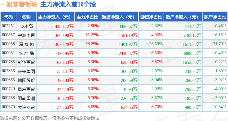 从资金流向上来看,当日一般零售板块主力资金净流出3.47亿元,游资资金净流出1.05亿元,散户资金净流入4.51亿元。一般零售板块个股资金流向见下表: