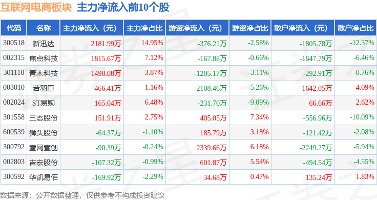 从资金流向上来看,当日互联网电商板块主力资金净流出2867.32万元,游资资金净流出4571.78万元,散户资金净流入7439.11万元。互联网电商板块个股资金流向见下表: