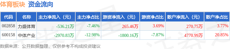 从资金流向上来看,当日体育板块主力资金净流出3507.04万元,游资资金净流出1534.71万元,散户资金净流入5041.75万元。体育板块个股资金流向见下表: