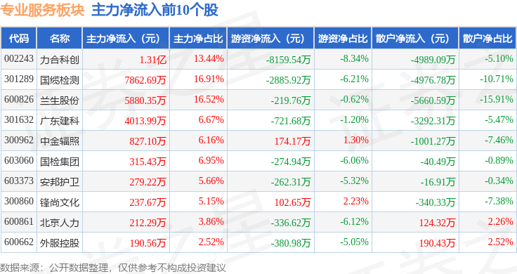 从资金流向上来看,当日专业服务板块主力资金净流入2.05亿元,游资资金净流出1.01亿元,散户资金净流出1.04亿元。专业服务板块个股资金流向见下表: