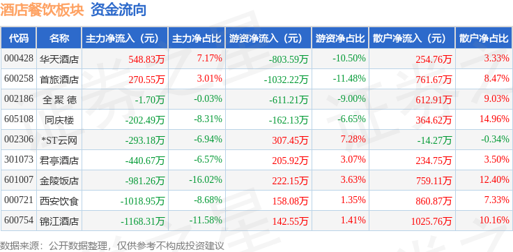 从资金流向上来看,当日酒店餐饮板块主力资金净流出3287.18万元,游资资金净流出1573.0万元,散户资金净流入4860.18万元。酒店餐饮板块个股资金流向见下表: