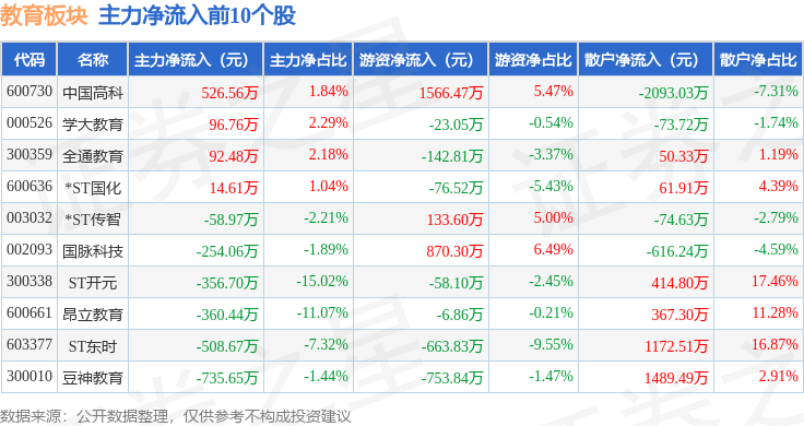 从资金流向上来看,当日教育板块主力资金净流出1.1亿元,游资资金净流出983.98万元,散户资金净流入1.2亿元。教育板块个股资金流向见下表: