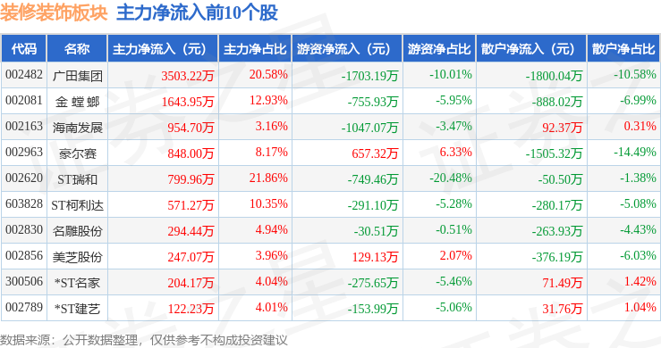 从资金流向上来看,当日装修装饰板块主力资金净流出2444.05万元,游资资金净流入1903.98万元,散户资金净流入540.07万元。装修装饰板块个股资金流向见下表: