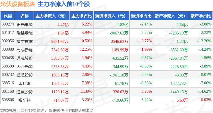 从资金流向上来看,当日光伏设备板块主力资金净流入6921.08万元,游资资金净流出7921.97万元,散户资金净流入1000.89万元。光伏设备板块个股资金流向见下表: