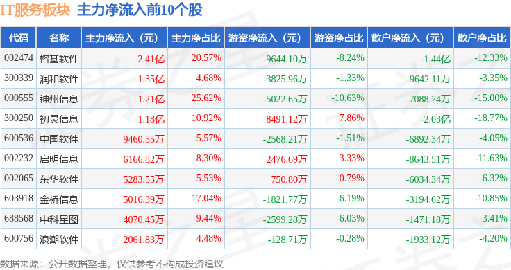 从资金流向上来看,当日IT服务板块主力资金净流出8.1亿元,游资资金净流入2.46亿元,散户资金净流入5.64亿元。IT服务板块个股资金流向见下表: