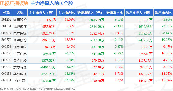 从资金流向上来看,当日电视广播板块主力资金净流入4724.02万元,游资资金净流出1.18亿元,散户资金净流入7118.63万元。电视广播板块个股资金流向见下表: