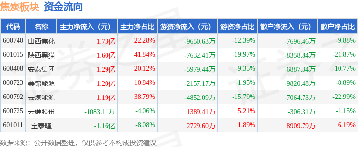 从资金流向上来看,当日焦炭板块主力资金净流入5.74亿元,游资资金净流出2.62亿元,散户资金净流出3.12亿元。焦炭板块个股资金流向见下表: