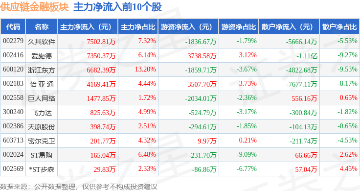 从资金流向上来看,当日供应链金融板块主力资金净流出3.0亿元,游资资金净流入811.42万元,散户资金净流入2.92亿元。供应链金融板块个股资金流向见下表: