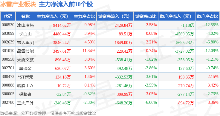从资金流向上来看,当日冰雪产业板块主力资金净流入3080.34万元,游资资金净流入4092.37万元,散户资金净流出7172.71万元。冰雪产业板块个股资金流向见下表: