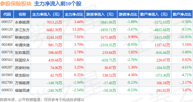 从资金流向上来看,当日参股保险板块主力资金净流出2.77亿元,游资资金净流出2726.13万元,散户资金净流入3.04亿元。参股保险板块个股资金流向见下表: