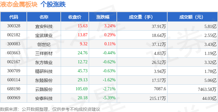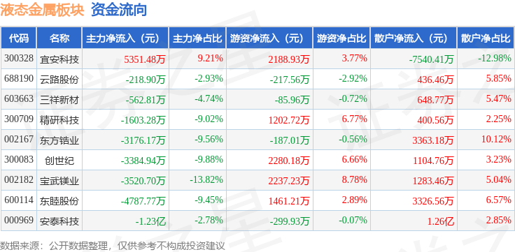 从资金流向上来看,当日液态金属板块主力资金净流出2.42亿元,游资资金净流入8579.81万元,散户资金净流入1.56亿元。液态金属板块个股资金流向见下表: