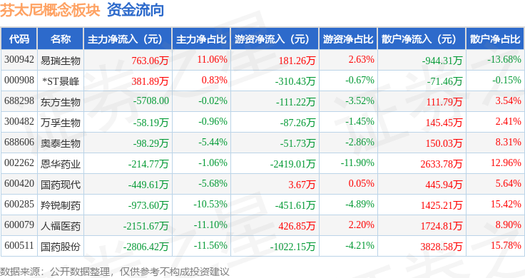 从资金流向上来看,当日芬太尼概念板块主力资金净流出5608.18万元,游资资金净流出3841.63万元,散户资金净流入9449.81万元。芬太尼概念板块个股资金流向见下表: