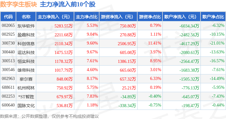 从资金流向上来看,当日数字孪生板块主力资金净流出6.32亿元,游资资金净流入2.69亿元,散户资金净流入3.64亿元。数字孪生板块个股资金流向见下表: