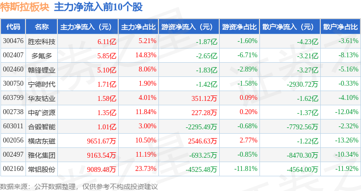 从资金流向上来看,当日特斯拉板块主力资金净流出30.93亿元,游资资金净流入3.78亿元,散户资金净流入27.15亿元。特斯拉板块个股资金流向见下表: