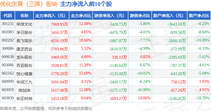 从资金流向上来看,当日优化生育(三孩)板块主力资金净流出9.22亿元,游资资金净流出1.36亿元,散户资金净流入10.58亿元。优化生育(三孩)板块个股资金流向见下表: