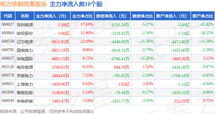 从资金流向上来看,当日电力体制改革板块主力资金净流入1.78亿元,游资资金净流出3.48亿元,散户资金净流入1.71亿元。电力体制改革板块个股资金流向见下表: